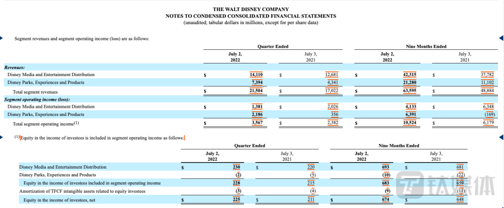 迪士尼2022財年第三季度各業務板塊營收