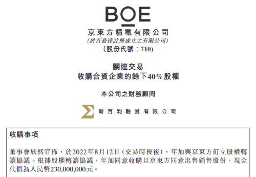 8月12日,京東方精電宣佈,其全資附屬公司年加投資有限公司(以下簡稱"年加投資")與京東方訂立股權轉讓協議,以人民幣2.3億元的價格收購京東方持有的成都京東方汽車電子有限公司40%股權。
