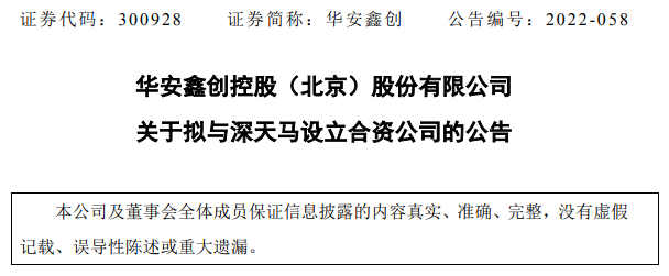 8月13日,華安鑫創發佈公告,擬與深天馬共同出資設立合資公司江蘇天華汽車電子科技有限公司(以下簡稱"合資公司"),註冊資本為10,000萬元人民幣,華安鑫創持股45%,深天馬持股55%。