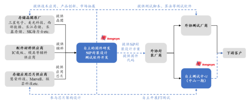 江波龍主要是根據市場需求確定產品方案后,開發存儲芯片固件,匹配存儲晶圓並定製主控芯片等主輔料,委託專業的封裝測試企業按照公司設計的封裝測試方案進行封裝測試。