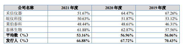 報告期內,海能技術的綜合毛利率分別為 70.43%、67.72%及 66.88%,存在逐年下滑之勢,不過整體高於同行業的平均水平。