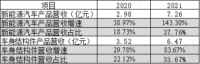 結合具體業務,也能基本驗證。車身結構件及新能源汽車產品是公司重點高附加值產品,近兩年營收增長明顯,2021年兩者營收佔比(取調整后總營收)均大幅提升。