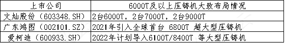 由於壓鑄機單價較高且屬於核心設備,大噸位壓鑄機的佈局也是參與者實力和決心的體現,對比上市同行在大噸位壓鑄機(6000T及以上)的大致佈局情況,公司投入相對較大。