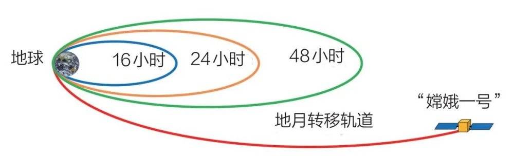 「嫦娥一號」正式踏上奔月之路前,需要在地球停泊軌道進行4次軌道控制。第一次控制在遠地點點火,將近地點高度從約250千米抬高到600千米,並將近地點調整到國內測控區的上空,為后續3次近地點加速做好鋪墊。前兩次近地點調相控制先將遠地點高度由5.1萬千米抬高到7.2萬千米,再抬高到12.1萬千米,軌道周期由16小時調整到48小時,為地月轉移做好了準備。