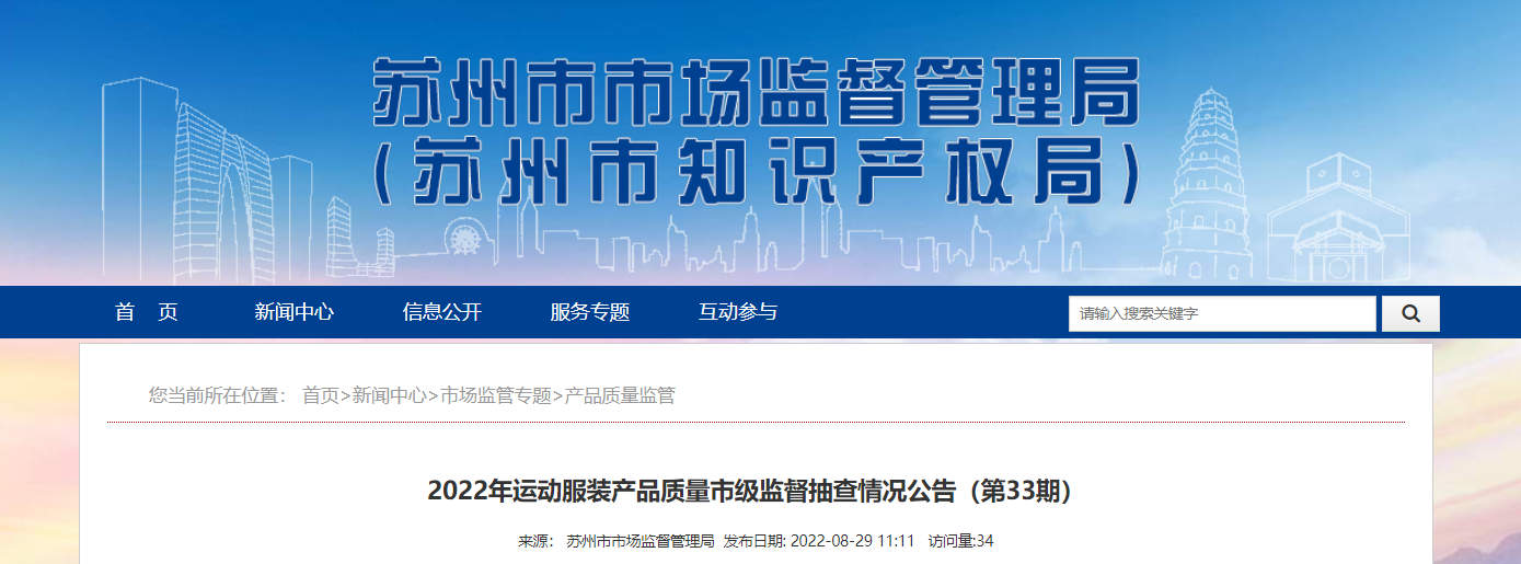 中國質量新聞網訊 近日,江蘇省蘇州市市場監督管理局網站發佈2022年運動服裝產品質量市級監督抽查情況公告(第33期)。