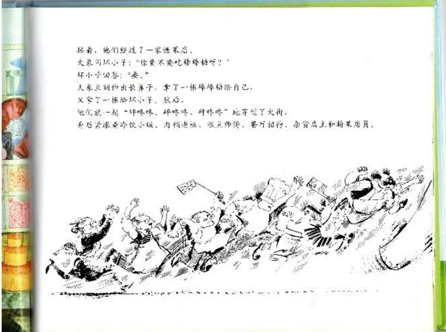 文字作者艾爾弗麗達·維旁特(Elfrida Vipont)以重複的句式和押韻的語言,講述了一個簡單有趣的故事:一個吃貨男孩,騎着一頭寡言的大象,一路「砰咚咚、砰咚咚、砰咚咚」地穿過大街、白吃白喝,引得一眾店鋪老闆和小攤主紛紛追趕。布里格斯以簡筆勾勒的冷飲小販、肉鋪老闆、糕點師傅、餐廳招待、雜貨店主、糖果店員、水果攤主們,氣急敗壞,怒目圓睜,惟妙惟肖。這是他第一次有機會,在一本繪本中,如此高密度地、圖像化現實生活中的不同職業身份的普通人們。這次引起強烈市場反響的創作,並非偶然的厚積薄發。