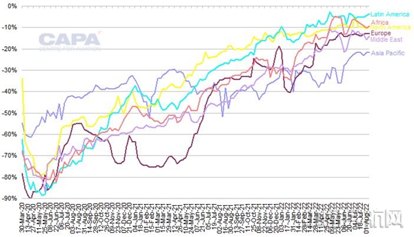 2020年3月30日至2022年8月8日,各地區航空旅客周座位量與2019年相比的百分比變化(來源:CAPA - OAG航空中心)