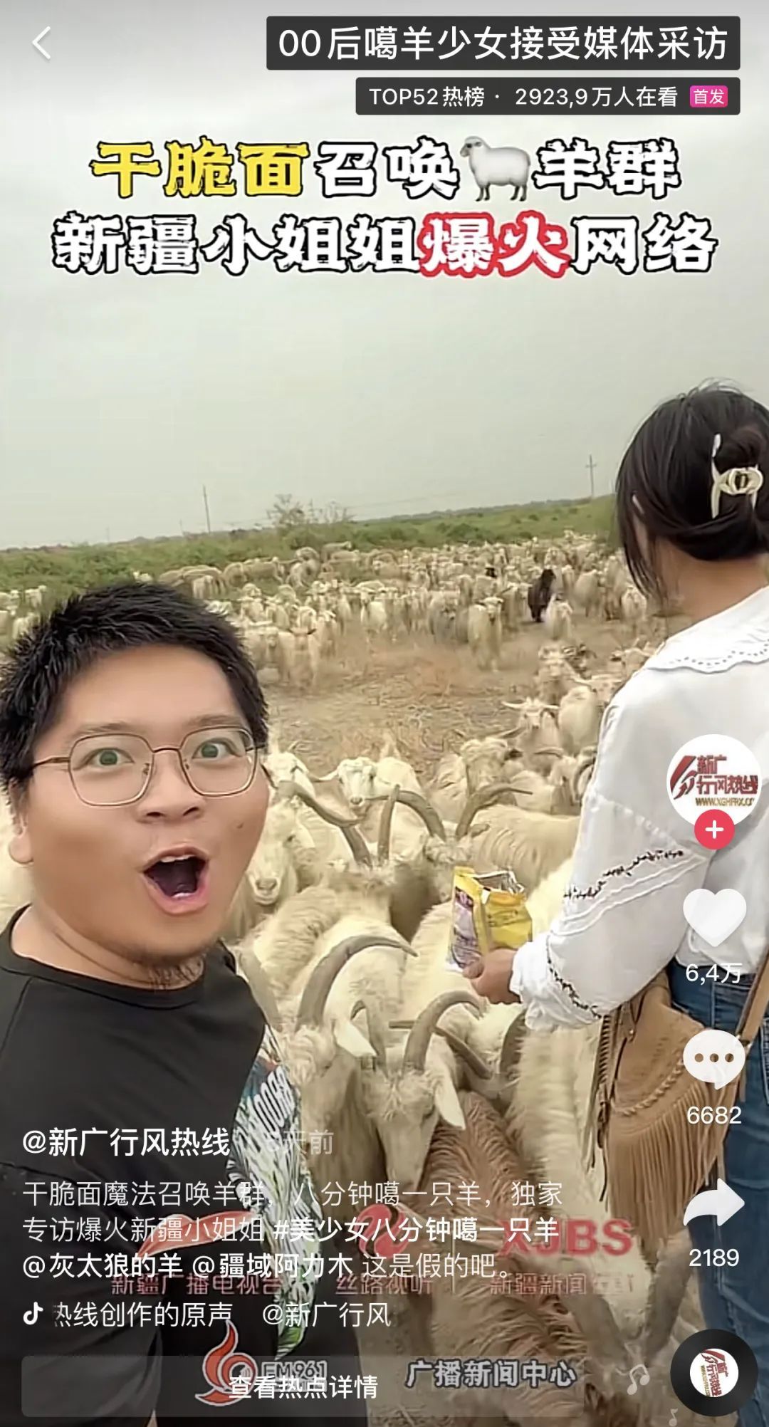 在抖音,因「梗」爆火併不少見。但「灰太狼的羊」的視頻卻有着與衆不同的氣質,她身處新疆巴音郭楞,視頻中隨處可見的是邊疆地貌和城市中絕不會見到的成羣牛羊。這種自然到極致的環境,與她網紅的身份形成的明顯的區隔,也成了她爆紅的助推力量。