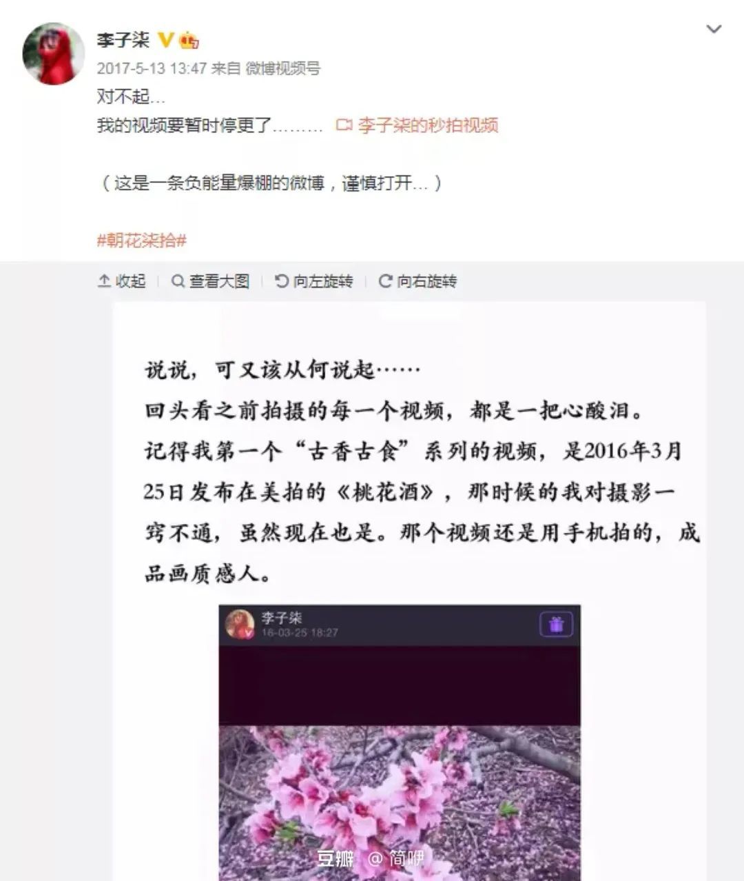 時間回到2016年,李子柒在美拍上發佈了第一條大火視頻:釀桃花酒。彼時她的視頻製作水準還相當粗糙,但視頻中延續至今的核心已然被提煉出來。不少人驚詫於她不食人間煙火的美貌和悠然自得的世外桃源生活,併爲此心向往之。