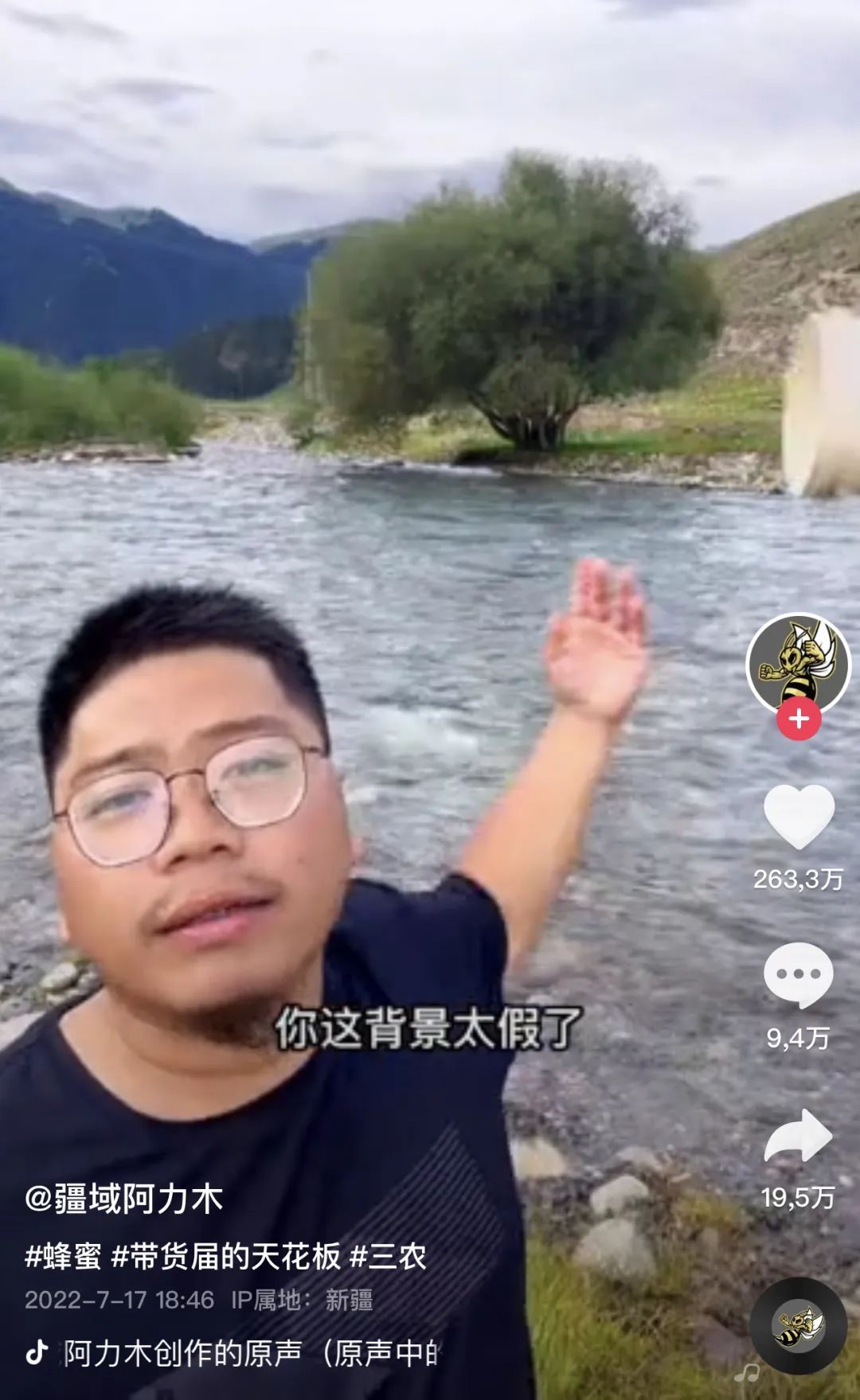 無獨有偶,不久前,另一位抖音達人「疆域阿力木」也曾因「你這背景太假了」而紅極一時。原因是疆域阿力木直播中身后的環境太過自然清澈,而阿力木本人的長相則與其背后的環境過於違和。