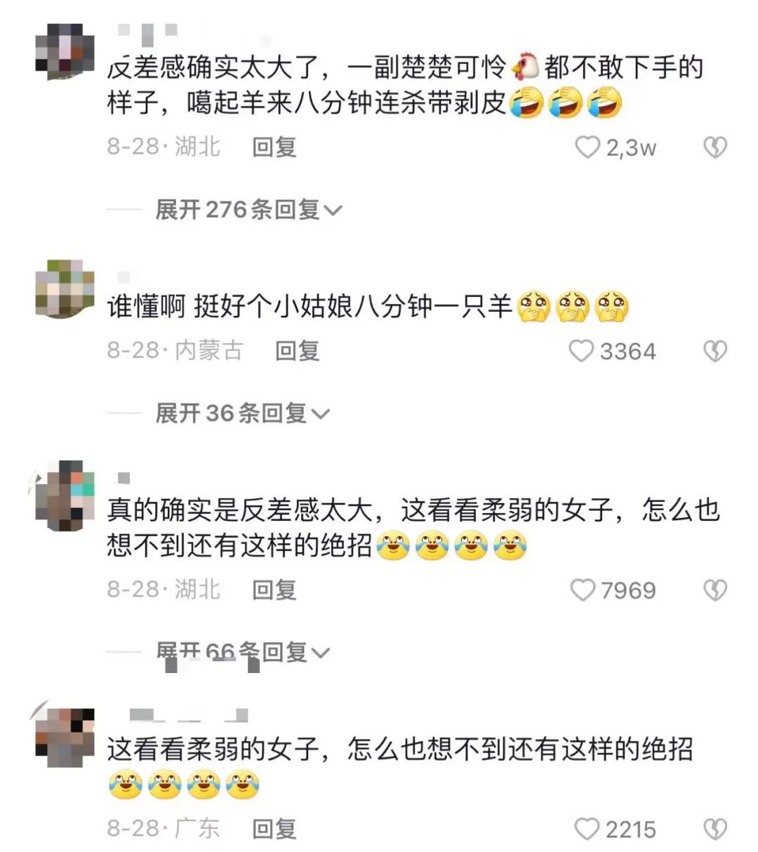 這句話,被網友們用來評價抖音網紅「灰太狼的羊」。不久前,「灰太狼的羊」在視頻中表演了「8分鍾殺羊」這一絕技。利落的手法,與不俗的美貌形成巨大反差,迅速調動起了抖人玩梗的熱情,「灰太狼的羊」也因此爆火。