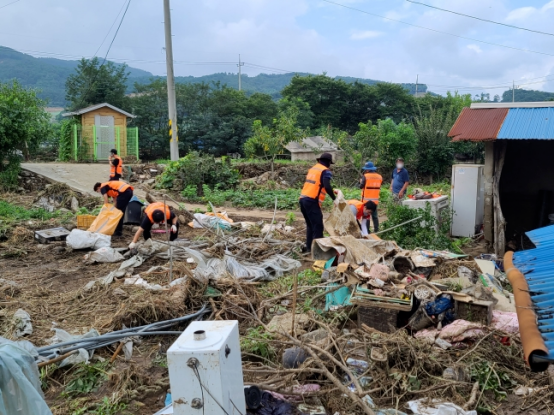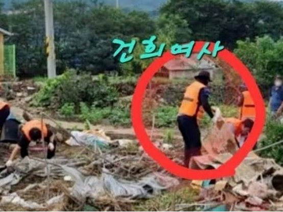 8月28日,金建希的粉絲后援會在臉書賬號上發佈了一張照片。照片中的場景是遭受水災后的忠清南道扶余郡,一片落敗之中,有一位頭戴黑色帽子、身穿工作服的女士,背對着鏡頭在現場救援。