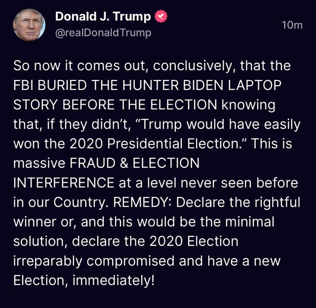 特朗普還在演講中提及了前段時間扎克伯格爆料FBI曾在2020年總統大選前夕暗示臉書封殺拜登黑料一事。「好吧,馬克·扎克伯格承認,在2020年,FBI找到臉書和媒體,向他們提供了虛假的説辭,稱來自地獄的亨特·拜登筆記本電腦是關於俄羅斯的虛假信息,儘管他們知道這不是真的。他們參與了這件事,説這是俄羅斯的假情報。」