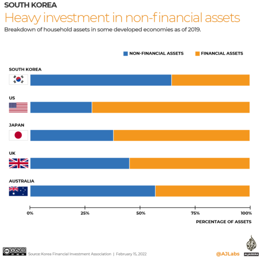 別看如今韓國人炒股這麼瘋,其實在韓國家庭資產構成中,股票等金融資產佔比一直很低,他們更希望把錢投資於房地產。