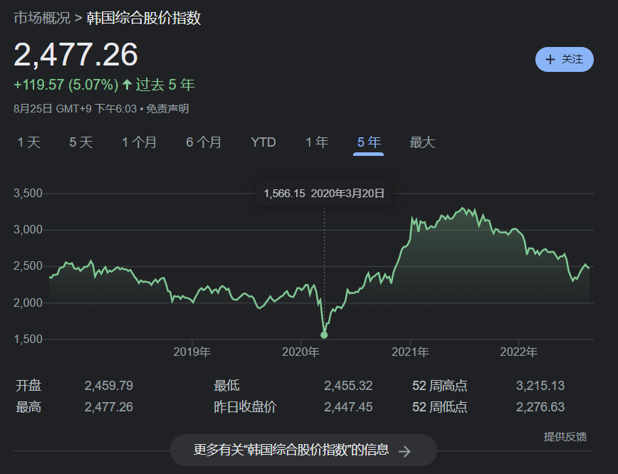 「 禁空令 」 一推出,韓國股市上演大反轉,截止去年 5 月,韓國綜合指數較 2020 年 3 月最低點累計大漲 123.38%,成爲了全球最牛的股市。