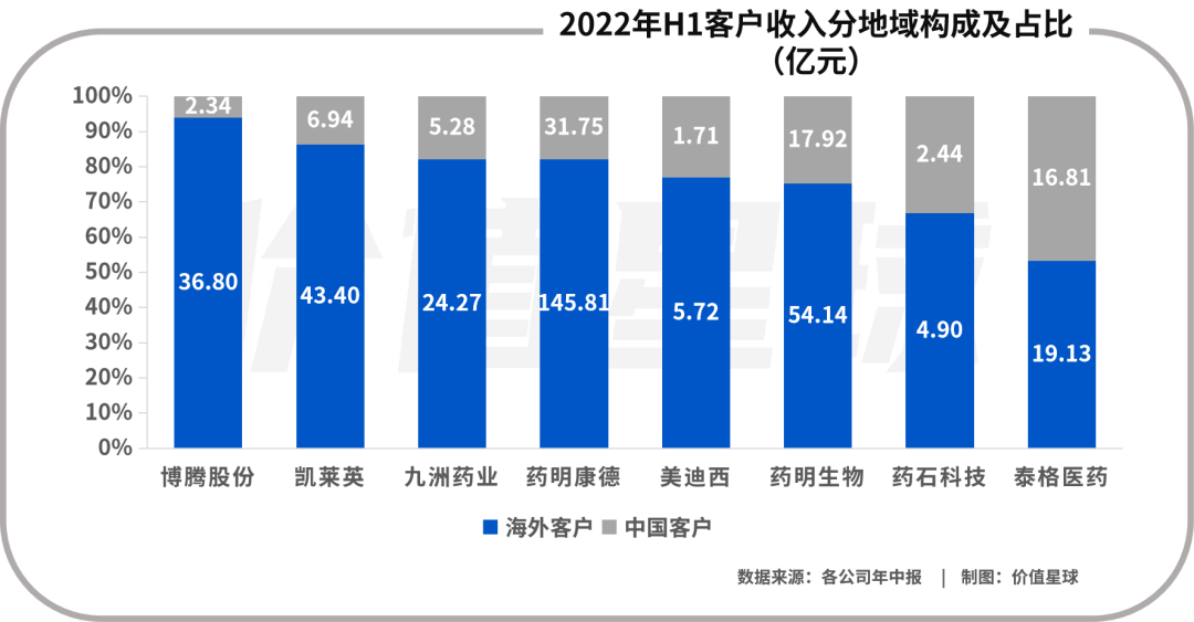 即使國內創新葯在近幾年迅速發展,但CXO企業目前的主要營收仍來源於海外。行業平均的海外營收佔比為70%,而凱萊英、博騰股份更達85%以上,而海外營收大部分又來自於羅氏、輝瑞、默沙東、BMS等少數全球頭部藥企。