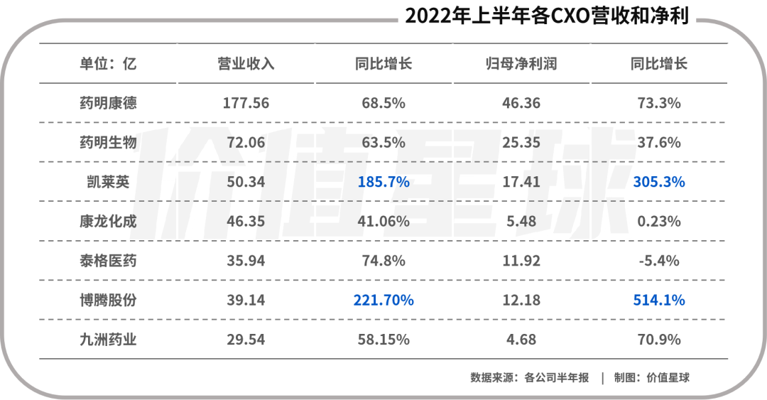 但在細分板塊表現上,CXO(醫藥外包服務)板塊已恢復之前的增長勢頭。截至8月30日,A股已有29家CXO上市公司發佈半年報,21家淨利潤同比增長,佔比超七成。其中不乏博騰股份和凱萊英這樣,營收利潤均成倍增長的企業。