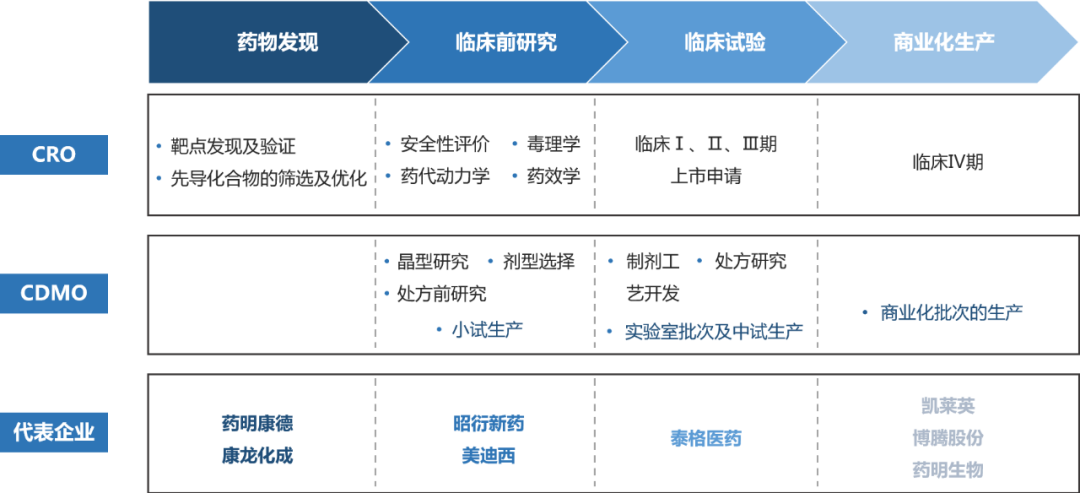 一款創新葯從無到有,將經歷藥物發現、臨牀前研究、臨牀試驗、商業化生產和銷售幾大環節(具體參見上期《》),而整個過程耗資達至少數億,耗時數年至十數年,隨着競爭加劇,醫藥企業逐步將一些環節外包給其它專業機構,這些就是時下火熱的CXO企業,根據產業鏈上下游分工分為: