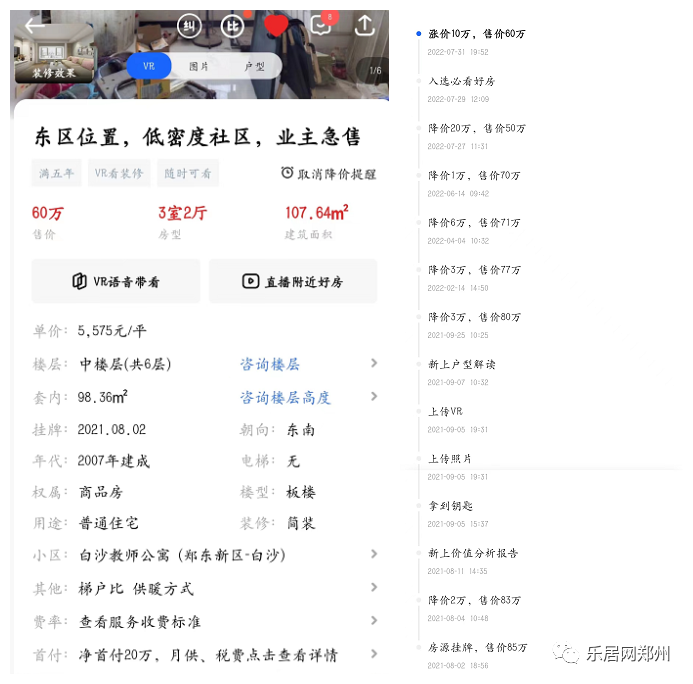 這個房源2021年8月2日掛牌售價85萬元,掛牌兩天於2021年8月4日就降價2萬,2021年9月25日降價3萬,2022年2月14日降價3萬,4月4日降價6萬,6月14日降價1萬,7月27日降價20萬,7月31日漲價10萬,目前售價60萬元。