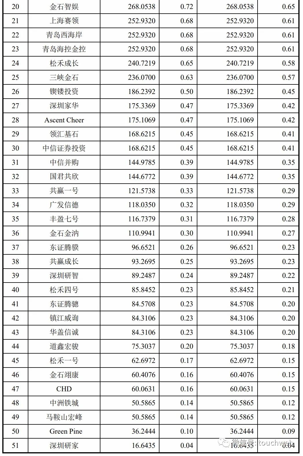鈦信一期持股為1.31%,平陽鈦瑞持股為1.27%,HH SPR-XIV持股為1.22%,豐盈六號持股為1.09%,鼎鋒華禪持股為1.05%,西藏家華持股為0.88%,上海賽薈持股為0.84%,領譽基石持股為0.82%,紅華一號持股為0.65%,金石智娛持股為0.65%;