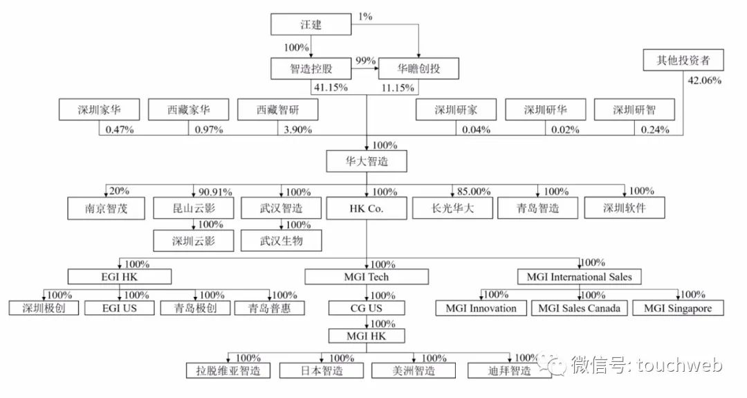 IPO前,汪建旗下智造控股持股41.15%,汪建旗下華瞻創投持股為11.15%;汪建間接持股為52.3%,為實控人。汪建還是華大基因董事長。