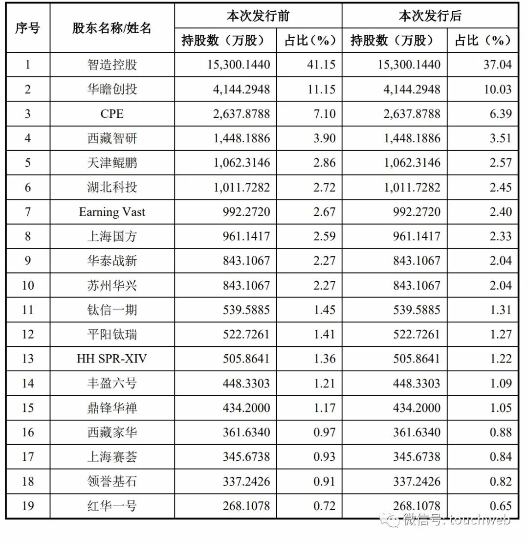 CPE持股6.39%,西藏智研持股為3.51%,天津鯤鵬持股為2.57%,湖北科投持股為2.45%,Earning Vast持股為2.4%,上海國方持股為2.33%,華泰戰新、蘇州華興分別持股為2.04%;