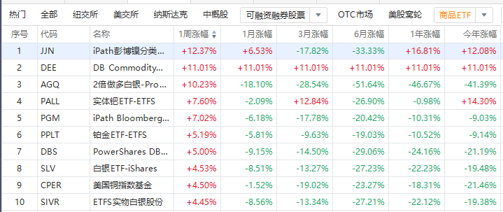 實體鈀ETF-ETFS、2倍做多白銀-ProShares漲幅分別為11.01%、10.23%;黃金錶現疲軟,2倍做多黃金-ProShares漲幅僅為0.8%。