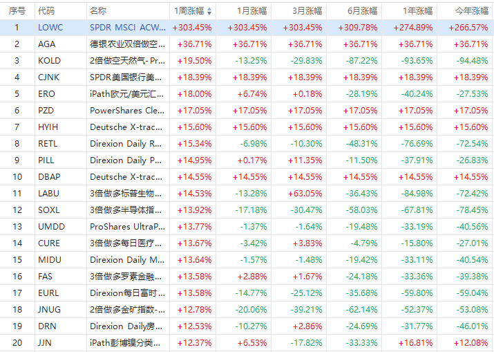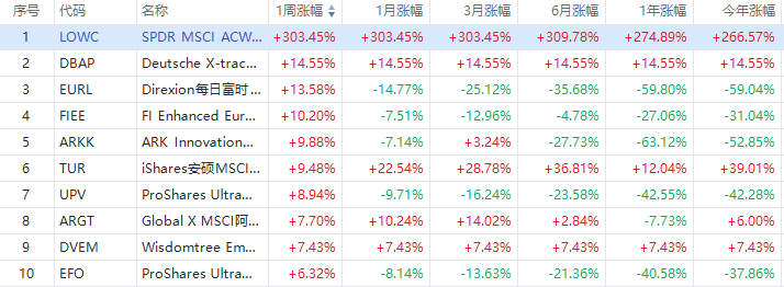區域ETF方面,此前持續表現弱勢的歐洲市場反彈,Direxion每日富時歐洲三倍看多漲幅拔得頭籌,累計漲幅13.58%,今年以來,累計跌幅59.8%;FI Ehanced Europe 50 ETN/UBS $FIEE 與ARKK $ARKK 漲幅分別為12.20%、9.88%。(LOWC、DBAP已退市)