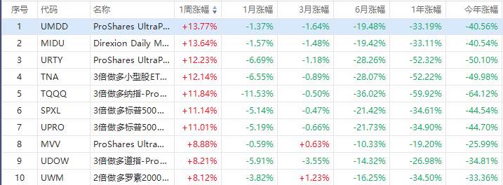 主要股指ETF方面,股市反彈做多類ETF漲幅居前,ProShares UltraPro MidCap400漲幅13.77%排名第一,Direxion Daily Mid Cap Bull 3X Shares漲幅13.64%;ProShares UltraPro 羅素2000 $URTY 、3倍做多小型股ETF-Direxion、3倍做多納指-ProShares分別漲12.23%、12.14%、11.84%。