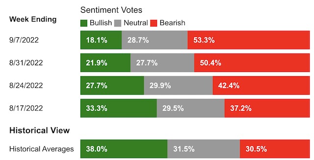 美國個人投資者協會(AAII)發佈的最新周度投資者信心調查結果顯示,過半數受訪者看空未來6個月的美國股市前景,看跌受訪者比例升至53.3%。AAII投資者信心調查在過去35年的歷史平均值是31%看跌和38%看漲,而在過去42周里,有41周看跌比例高於歷史平均值。