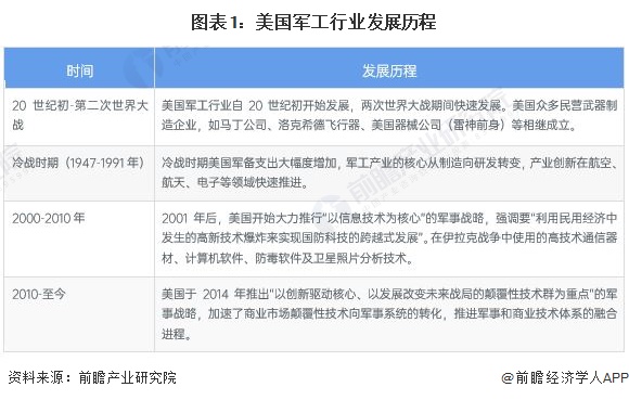 美國軍工電子行業自20世紀初開始發展,於冷戰時期快速發展,產業創新在航空、航天、電子等領域快速推進。2010年至今,美國軍工行業的發展戰略主要為研發顛覆性技術,促進了軍工電子行業的技術研發。