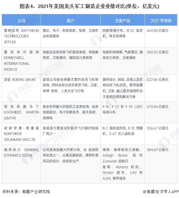 美國軍工行業的龍頭企業有霍尼韋爾國際、洛克希德·馬丁公司、雷神公司等,均為全球性的跨國企業,其產品種類豐富,營收規模較大。