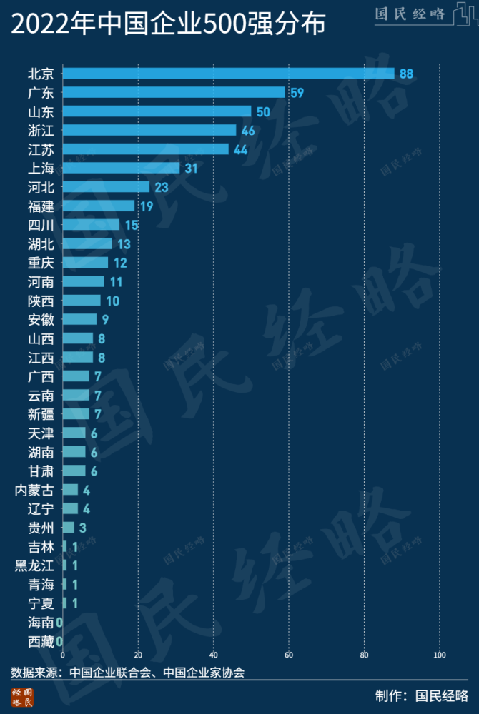 從區域分佈來看,中國500強企業分佈在29個省份,除了海南、西藏外,皆有企業入圍。