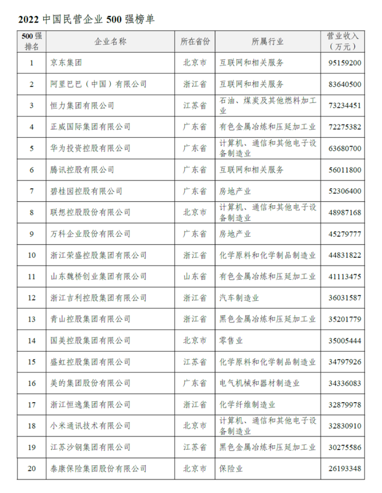 日前,全國工商聯發佈2022中國民營企業500強榜單。