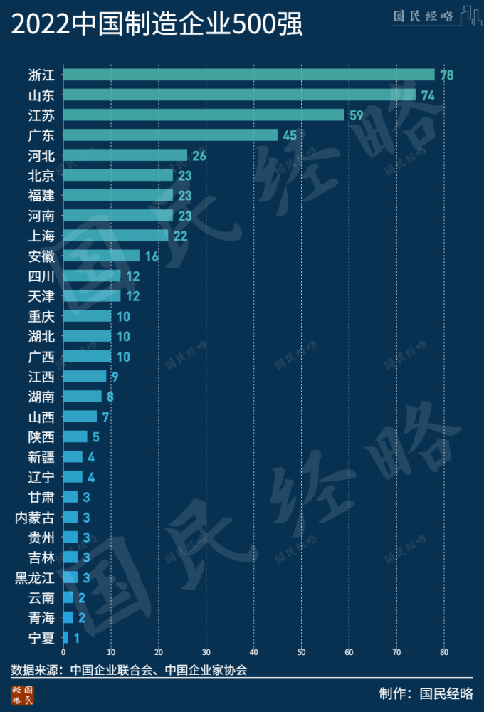 根據中國製造企業500強名單,中國製造業第一梯隊,主要分佈在浙江、山東、江蘇、廣東四省,佔了一半以上。