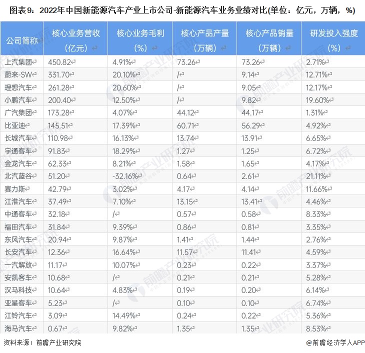 有關新能源汽車業務的業績情況,上汽集團(600104.SH)的核心業務營收最高,超過400億元;理想汽車(02015.HK)、蔚來-SW(09866.HK)等企業的毛利水平較高,超過60%;產銷規模以上汽集團(600104.SH)、比亞迪(002594.SZ)、廣汽集團(601238.SH)較高;研發投入強度北汽藍谷(600733.SH)等企業較高。