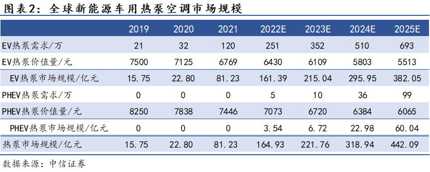 隨着熱泵車型滲透率的加大和新能源車需求量的擴大,車用熱泵空調市場空間也進而擴大。據中信證券預測,2022年全球新能源車熱泵空調市場將達到164.93億元,而到2025年則將高達442.09億元,複合增長率為168.05%,是新能源汽車產業鏈上增長空間*的細分產業之一。