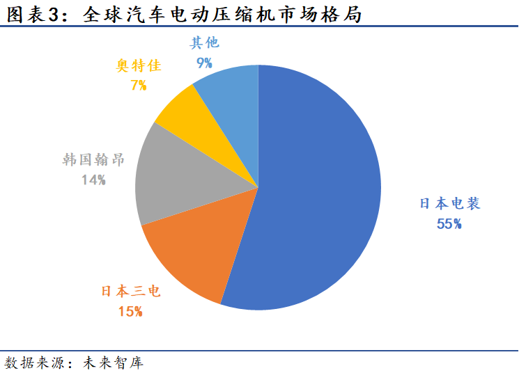 但也需要注意到,儘管部分零部件國產供應占優,但其中價值量和技術壁壘最高的電動壓縮機卻還是被外資品牌壟斷。目前,新能源車電動壓縮機市場格局與傳統燃油車機械壓縮機大體一致,電裝、三電和翰昂合計市佔率超過80%,牢牢把控整個車用電動空氣壓縮機市場。而具備量產能力的國產電動壓縮機供應商則僅有奧特佳(002239.SZ)一個,在這個熱泵空調細分產業里市場規模*的領域,國產替代依然前路漫漫。