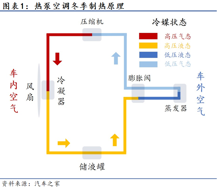 儘管尚未成為市場*,但從制熱原理來看,熱泵空調有着PTC空調永遠無法匹敵的優勢——能耗低。前文提到,PTC空調是通過電能流經電阻直接加熱空氣,在不考慮損耗的情況下,能效比也無法超過1,這就意味着靠電能驅動的新能源車在冬季續航里程數將直線減少。而熱泵空調則是通過少量電能驅動製冷液迴流,將外部熱量帶入車內,在非極低温天氣下能效比可遠超1,有效延長冬季續航里程。