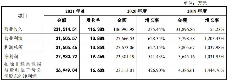招股書顯示,過去三年,公司的營業收入分別為3.19億元、10.7億元和23.15億元,同比增速分別為55.23%、235.44%和116.38%,年均複合增速達到124.18%;淨利潤方面,則達到0.36億元、2.34億元和2.79億元,年均複合增速達到296.06%。