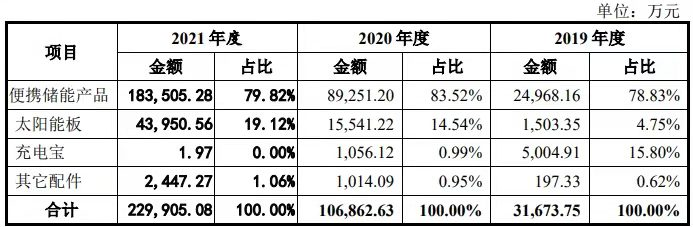 其中,應用於户外旅行、應急備災等場景的便攜式儲能產品已然成為華寶新能營收的頂樑柱,過去三年營收佔比分別達到78.83%、83.52%和79.82%。反觀曾經的主力業務充電寶,營收佔比逐年下滑,2019年時為15.8%,至2021年時充電寶業務營收佔華寶新能總營收的比例幾乎可以忽略不計。