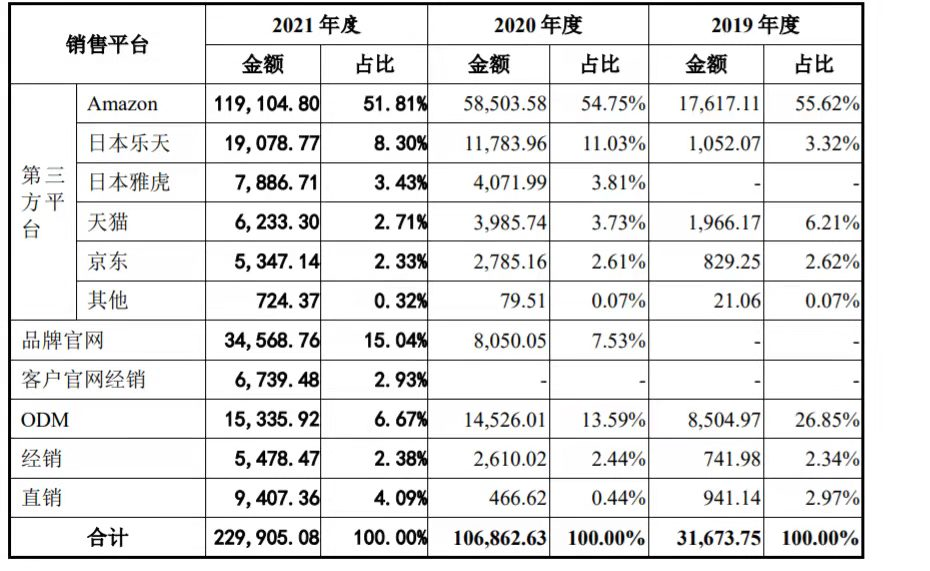 渠道上,華寶新能則主要通過亞馬遜、日本樂天、日本雅虎等第三方平臺銷售產品。2019年至2021年,公司通過這些第三方電商平臺獲得的線上銷售額佔總營收比重分別為67.83%、75.99%和68.89%。其中,僅來自亞馬遜的線上銷售額佔總營收的比例就達到了51.81%,佔據半壁江山。