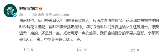 消費者只需要微博私信野獸派你的故事,野獸派就會根據故事定製一束鮮花,小束花的價格是150元,中束花的價格是300元。並且事后會以匿名的方式,將花束和故事打包進行營銷宣傳。