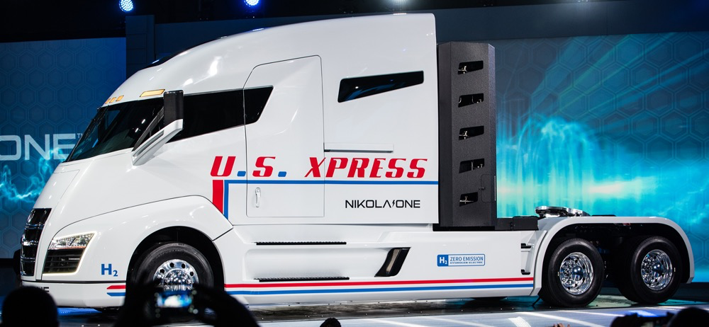 舞臺上擺着一輛巨大的紅白藍相間的半掛卡車,這正是尼古拉的一號原型車。