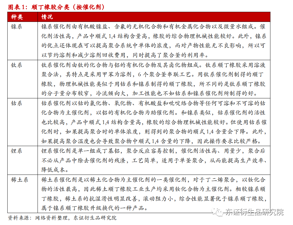 順丁橡膠主要有三種分類方式:按聚合方法分類,順丁橡膠生產工藝可分為溶液法、溶乳法及氣相法,目前全球順丁橡膠生產大部分採用溶液法;按催化劑分類,順丁橡膠生產採用的催化劑主要有鎳系、鈦系、鈷系、鋰系、稀土系(釹系)等;按聚合物的微觀結構分類,可分為高順式、中順式、低順式、中乙烯基、高乙烯基等各種聚丁二烯橡膠。