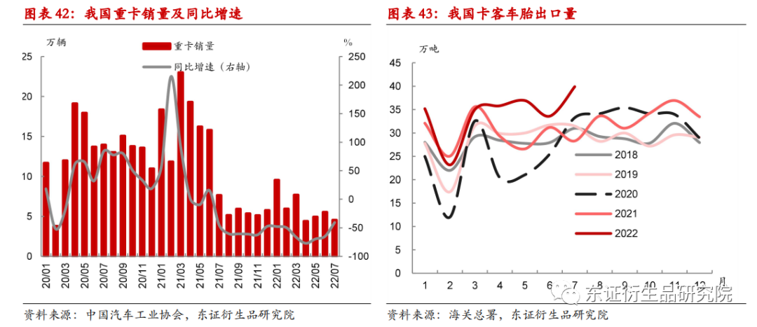 今年以來公路貨運量不足、運費低迷、政策刺激后重卡新車保有量過高等因素持續壓制國內重卡新增需求,1-7月份重卡銷量較去年同期下降了62%,對卡客車配套胎需求構成了明顯拖累;此外,大宗貨物和中長途貨物運輸的公路運輸需求不足也導致卡客車替換胎市場需求明顯減弱。雖然今年以來我國卡客車胎出口需求韌性猶存,但由於內需表現不佳,加上疫情階段性擾動下部分輪胎企業會被迫停限產,今年以來國內全鋼胎企業開工率持續偏低運行。