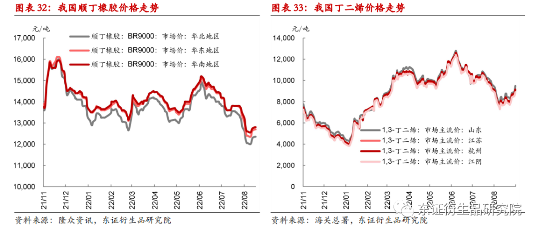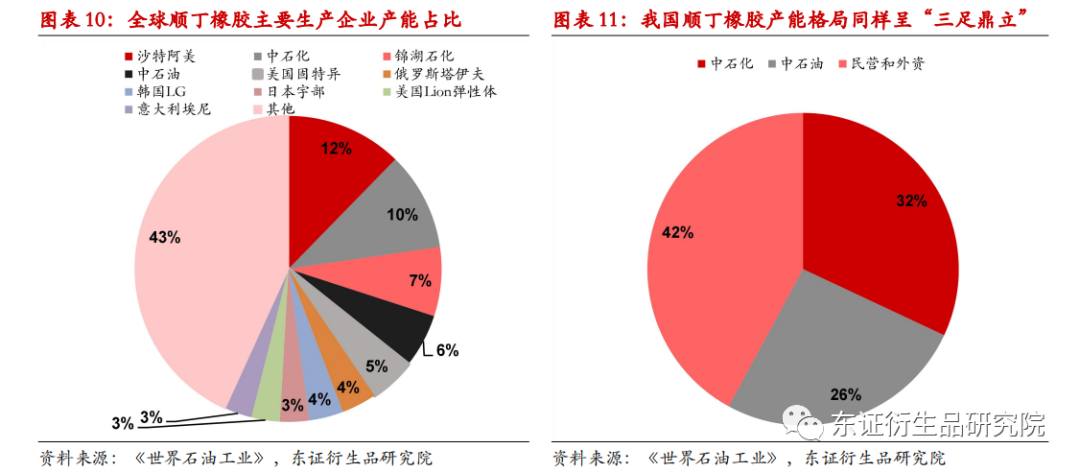 目前用於輪胎生產的主要是高順式順丁橡膠,具有彈性高、耐磨性好、耐寒性好、生熱低、耐曲撓性和動態性能好等特點。以天然橡膠為主要原料的橡膠製品在生產中適量添加順丁橡膠,可進一步改善天然橡膠製品的耐寒性、耐磨性、彈性和動態性能等。而在順丁橡膠中摻用天然橡膠可以改善順丁橡膠的輥筒行為,增加粘性,進一步提高硫化膠的撕裂強度和拉伸強度。整體來看,天然橡膠與順丁橡膠並用可以改善膠料的工藝性能與使用性能,使用共混膠料製作的成品在機械強度、耐磨性、抗撕裂性能、耐老化性等指標上表現得更加優異。此外,雖然天然橡膠和順丁橡膠均主要用於輪胎生產,但與研究天然橡膠需求端重點關注全鋼胎市場不同,研究順丁橡膠需求端要重點關注半鋼胎市場,半鋼胎對順丁橡膠消費端的影響程度更大,相關分析我們在系列報告一中已有提及,此處不再贅述。