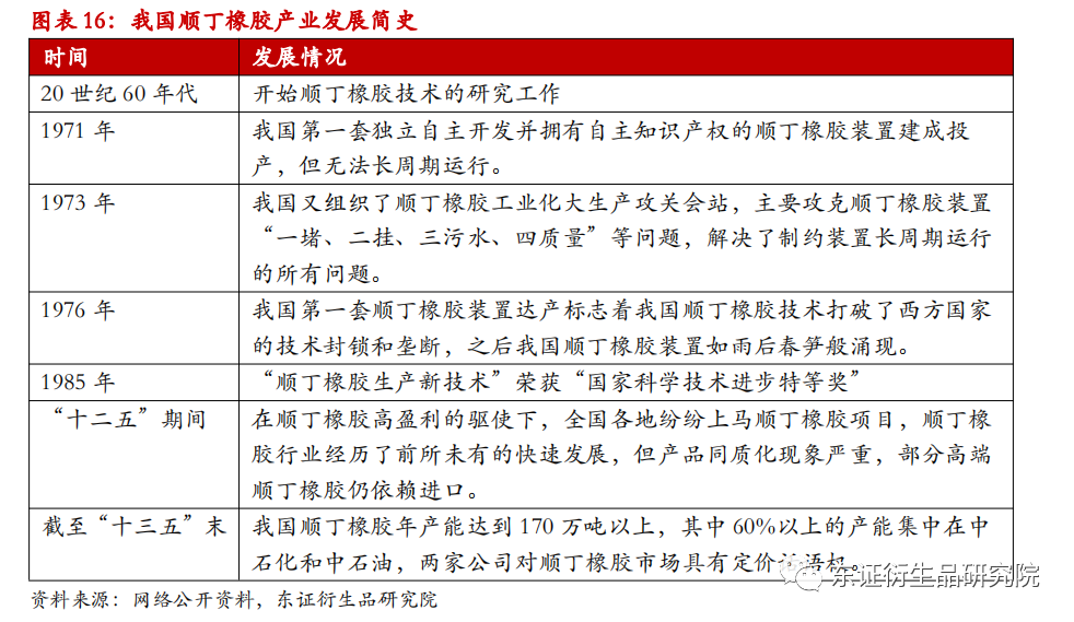 順丁橡膠是我國合成橡膠中採用自主開發技術生產的膠種之一,由於國外順丁橡膠生產企業對我國實施技術封鎖,我國於20世紀60年代開始順丁橡膠技術的研究工作。1966年我國曾組織順丁橡膠生產技術的開發攻關會戰,範圍包括單體、聚合、凝聚乾燥、溶劑回收等,涵蓋了順丁橡膠工業化生產的全過程。