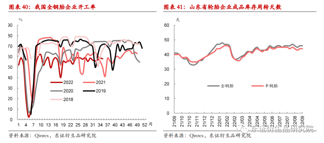此外,雖然今年以來乘用車胎的配套和出口端均表現較好,但受疫情影響,替換胎銷量下滑較多,因此國內半鋼胎企業開工率持續受到壓制,上行明顯受限。