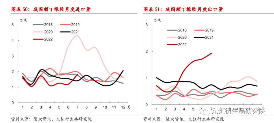 貿易方面,15年以來我國順丁橡膠年度進口量基本維持在20萬噸以上。2020年以前我國順丁橡膠年度出口量未超過5萬噸,近兩年順丁橡膠出口量持續大幅增長。